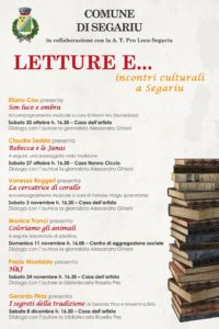 Nel 2018, tra ottobre e novembre, ho curato la rassegna “Letture e… incontri culturali a Segariu” organizzando e conducendo le prime quattro presentazioni.